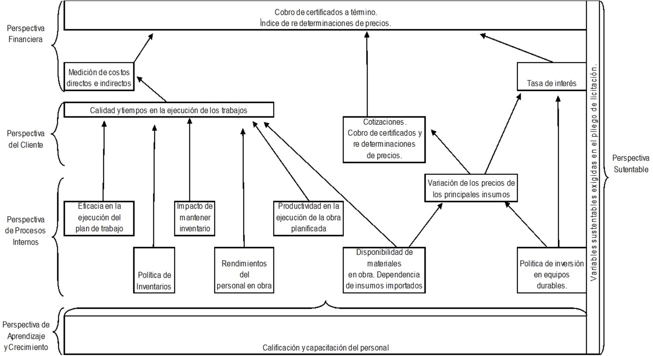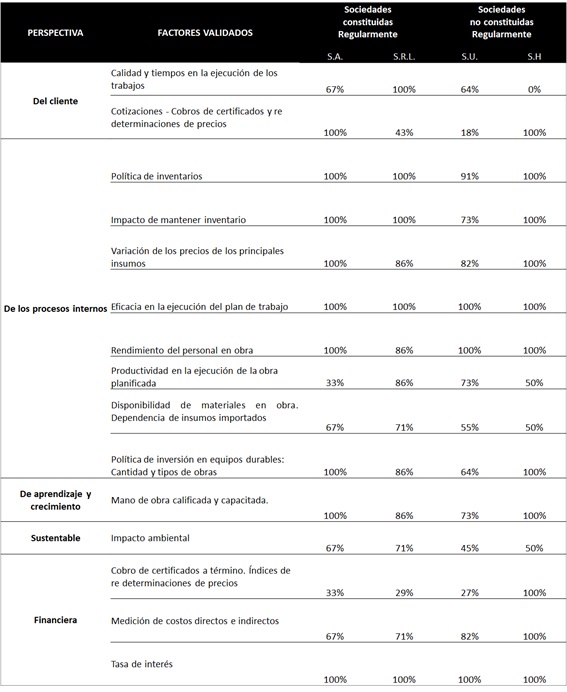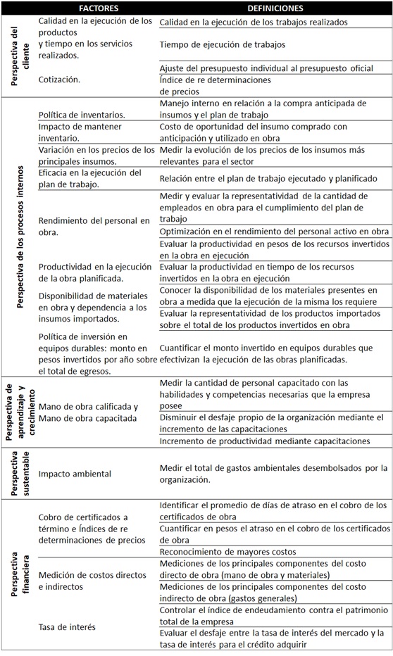 El trabajo tiene por objeto relevar la importancia relativa de los factores intervinientes en el desempeño del sector de la construcción del departamento capital de la provincia de La Pampa. Parte de la hipótesis de que los empresarios, gerentes y administradores de las empresas constructoras del medio valoran más los factores económicos–financieros, dejando de lado lo relativo al ambiente, los procesos productivos, tecnológicos y organizacionales. Para abordar el objetivo y corroborar la hipótesis, se realizaron entrevistas semi estructuradas a los empresarios, gerentes y administradores de las empresas constructoras que se encontraban habilitadas en el Registro de Licitadores. Se analizaron las diferentes perspectivas del tablero de comando con el fin de obtener los factores más representativos en el proceso de toma de decisiones y evaluación del desempeño. Estos datos fueron procesados y posteriormente validados por agentes calificados. Los factores fueron agrupados en cinco perspectivas, dispuestas en un flujograma relacional de tablero de comando como herramienta de gestión. Se concluyó que las empresas y los agentes calificados consideran relevante para la toma de decisiones del sector el factor rentabilidad, es decir, la oportunidad de ganar dinero, y dejan de lado perspectivas importantes para la sostenibilidad del negocio.