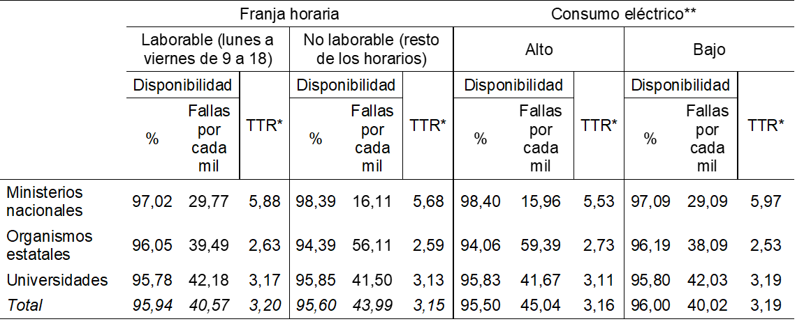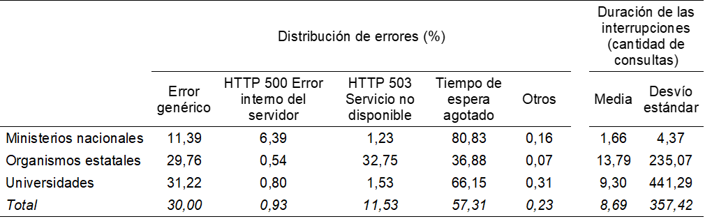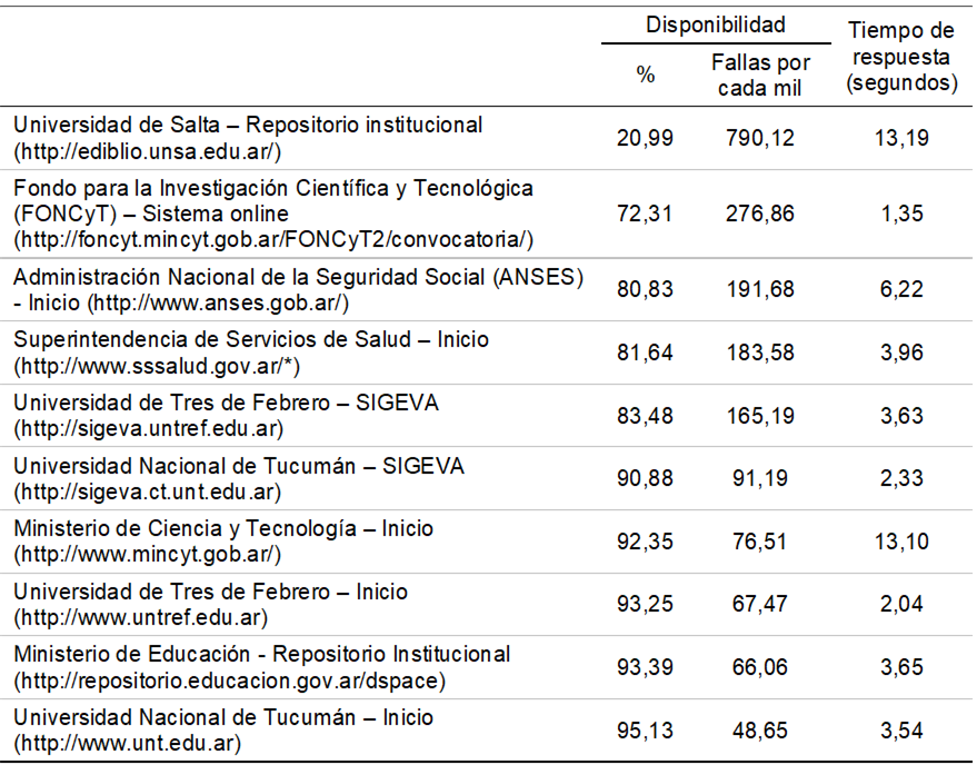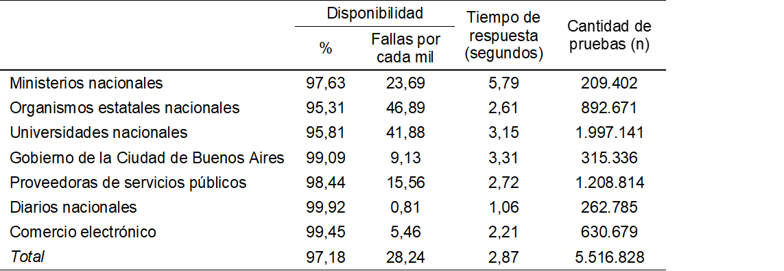 Este artículo presenta los resultados de un relevamiento anual de calidad de servicio de servidores estatales de la Argentina. Por medio de ello, se busca dar cuenta de la importancia de la evaluación sistemática de la infraestructura pública digital de servicios de gestión e información gubernamental. En el caso de la infraestructura estatal, la importancia de su estabilidad técnica tiene una relevancia especial, en tanto la oferta de servicios estatales representa en muchos casos el acceso o la denegación de derechos tan básicos como la educación, la salud o el trabajo. El monitoreo se realizó durante 12 meses sobre 59 sitios dependientes del estado nacional, pudiendo observarse en ellos un rendimiento deficiente en comparación a los grupos de servicios seleccionados como grupos de referencia. Este peor rendimiento se registró tanto en su nivel de disponibilidad como en el tiempo total de respuesta a las solicitudes. Los sitios dependientes del Estado nacional mostraron a su vez patrones de falla diferenciados según grupo de pertenencia (ministerios nacionales, organismos estatales y Universidades nacionales) sugiriendo la existencia de infraestructuras y formas de trabajo heterogéneas que confluyen en todos los casos en altos niveles de no disponibilidad de las plataformas ofrecidas.