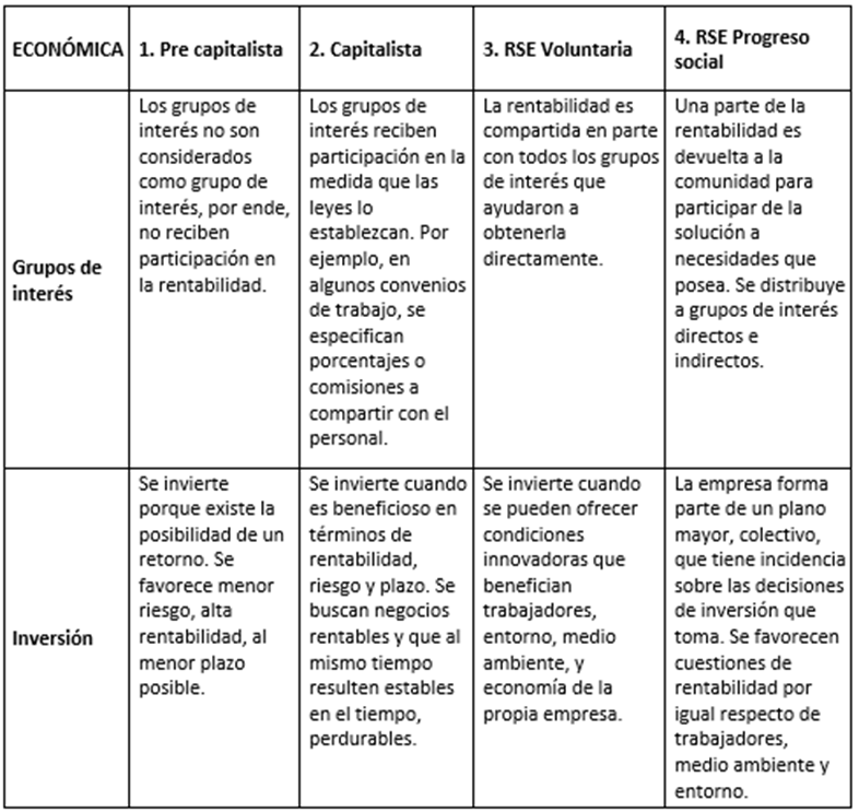 En el estudio de la responsabilidad social empresaria (RSE), generalmente se acepta un conflicto central: la convivencia entre los objetivos económicos, los impactos ambientales y los impactos sociales. Así, es factible identificar distintos planos evolutivos que le dan significado, desde concepciones pre capitalistas, pasando por criterios capitalistas, la responsabilidad como concepto voluntario, y finalmente la empresa en función de la sociedad.