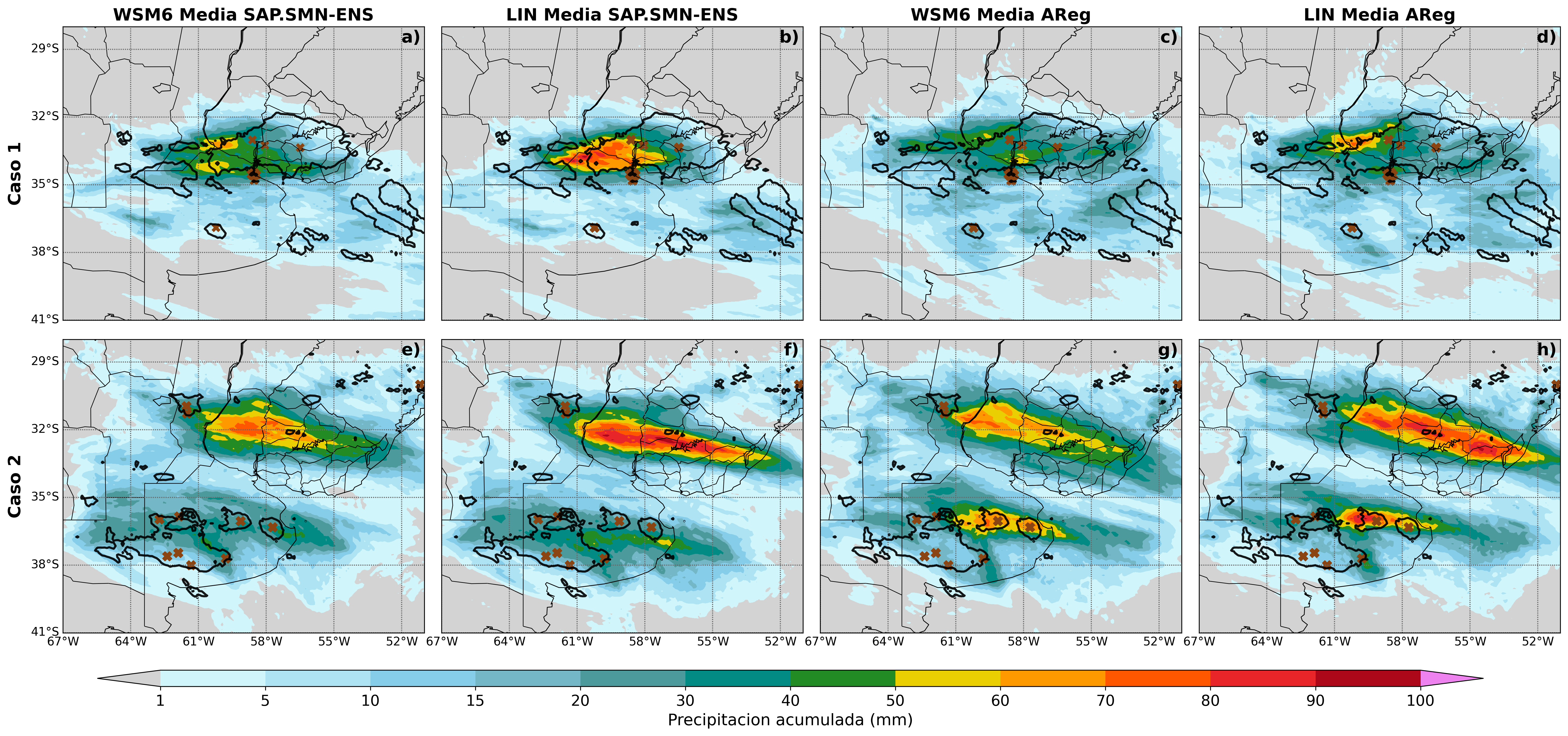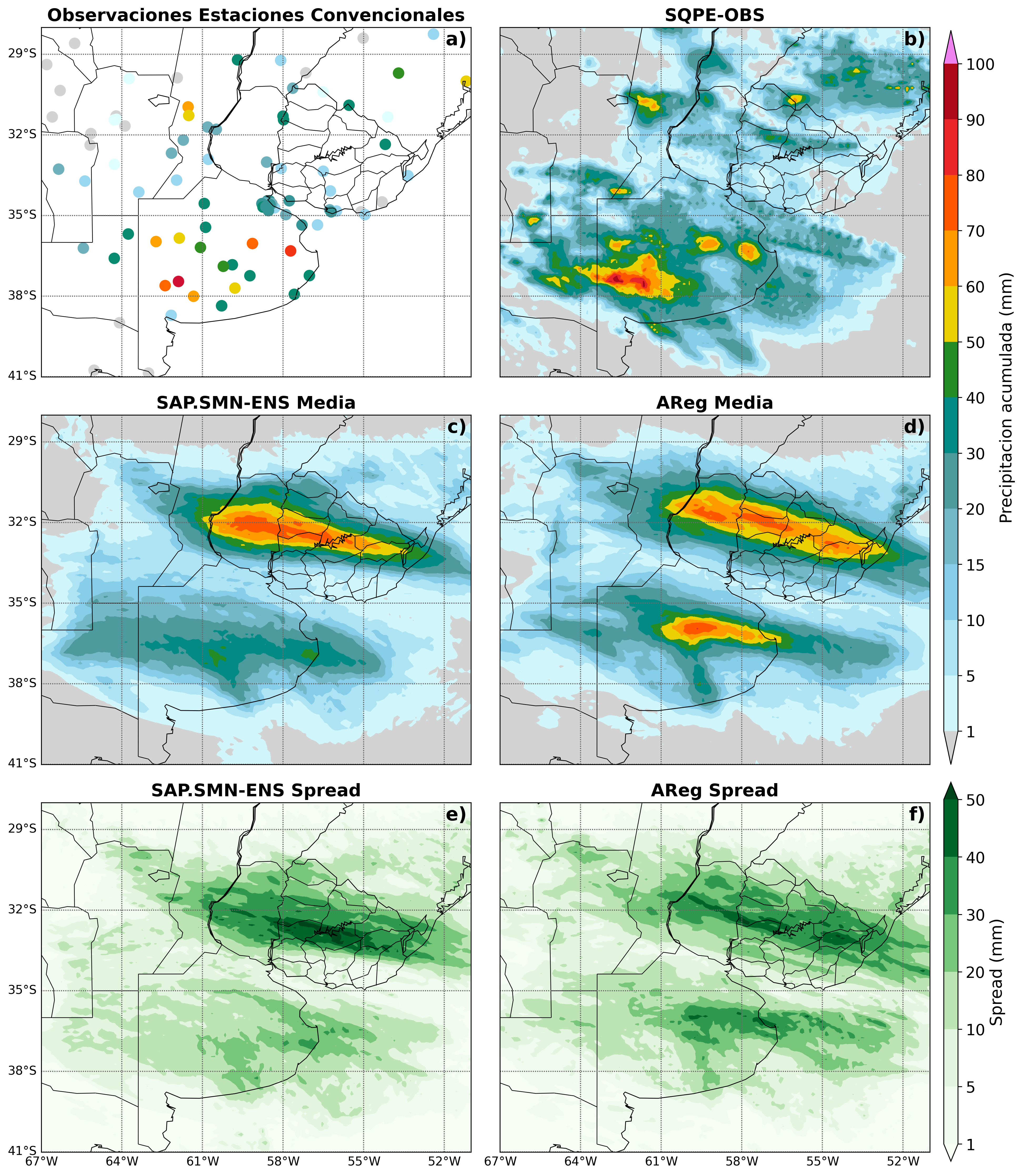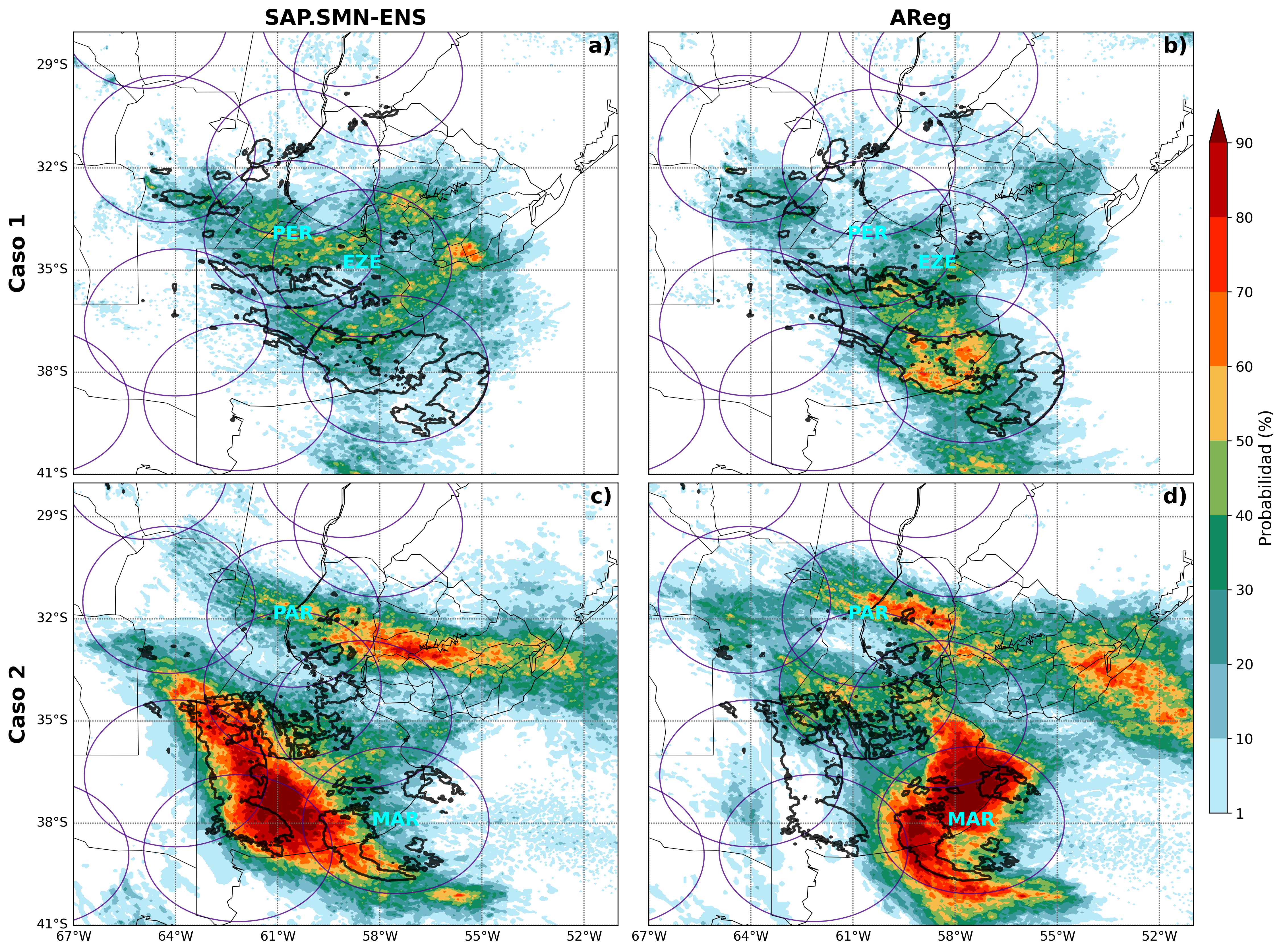 En este trabajo se busca evaluar el desempeño de los pronósticos probabilísticos en alta resolución (4 km) generados a partir del Sistema de Asimilación de datos y Pronóstico numérico del Servicio Meteorológico Nacional de Argentina (SAP.SMN) y estudiar el impacto de las condiciones iniciales en los mismos, considerando pronósticos inicializados a partir de un ensamble de análisis regionales (AReg) y de análisis globales (SAP.SMN-ENS). Se seleccionaron 2 casos de estudio para analizar el desempeño de ambos pronósticos, caracterizados por el desarrollo de convección húmeda profunda y precipitación intensa sobre el centro-este de Argentina y Uruguay, ocurridos el 26-27 de febrero y el 6-7 de marzo de 2022. Para verificar los pronósticos probabilísticos se utilizaron datos de estimación cuantitativa de precipitación por satélite SQPE-OBS, reflectividad máxima de radares de banda C, datos de estaciones convencionales y radiosondeos. En líneas generales, se puede considerar que AReg mostró un mejor desempeño para el caso 1 y SAP.SMN-ENS lo hizo en el caso 2, indicando un impacto significativo de las condiciones iniciales en el desempeño del pronóstico. En ambos casos de estudio, ambos experimentos logran representar adecuadamente los sistemas convectivos respecto de los datos de radar, con ciertas diferencias en la posición e intensidad de los mismos, dando como resultado una subestimación de la precipitación acumulada en 24 horas en las zonas de máxima precipitación estimada por SQPE-OBS. Estos resultados son alentadores respecto de la inclusión de observaciones locales en la condición inicial de los pronósticos numéricos en alta resolución del SAP.SMN-ENS y motivan a seguir avanzando en el desarrollo de un sistema regional de asimilación de datos que permita mejorar la precisión de los pronósticos, investigando aspectos como la configuración y la estrategia de asimilación.