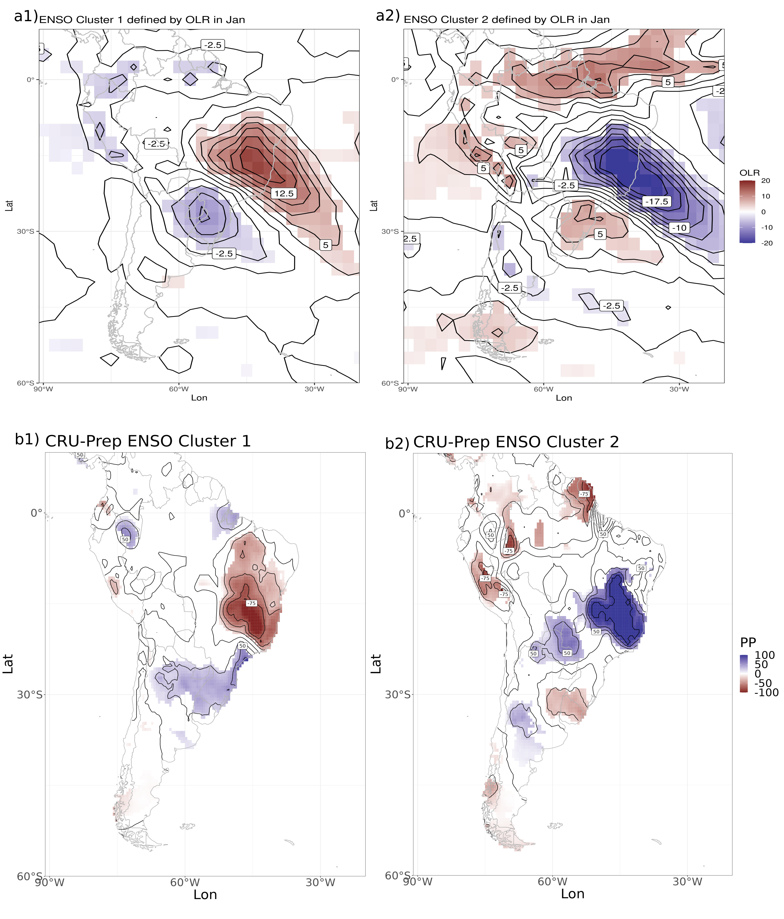 El Niño-Oscilaci´on del Sur (ENOS) es el principal forzante de la variabilidad de la precipitaci´on interanual sobre Sudam´érica (SA), especialmente de septiembre a diciembre, a trav´es de un dipolo de convecci´on sobre la regi´on de la Zona de Convergencia del Atl´antico Sur (SACZ) y sobre el sureste de SA (SESA). Los mecanismos forzantes de la precipitaci´on de enero bajo eventos ENOS est´an menos conocidos. Un an´alisis de grupos aplicado a las anomal´ías OLR de enero sobre SA Tropical-Subtropical bajo eventos ENOS muestra dos grupos vinculados a los dos signos del dipolo de convecci´on entre la regi´on de la SACZ y SESA. La mayor´ ıa de los eventos La Ni˜ña (LN, 10 de 13 eventos) est´an asociados con una convecci´on aumentada sobre SESA e inhibida sobre la regi´on de la SACZ en enero. Los eventos El Ni˜ño (EN) muestran ambos signos del dipolo de convecci´on en proporciones iguales, evidenciando una respuesta no lineal. En enero, para EN y LN, la convecci´on aumentada (inhibida) sobre SESA y la convecci´on inhibida (aumentada) sobre la regi´on SACZ est´an asociadas con la circulaci´on troposf´ erica anticicl´onica (cicl´onica) sobre el sureste de Brasil, como se observ´o en la primavera para EN (LN). Durante los eventos LN, la circulaci´on troposf´ erica en niveles bajos en enero depende de las condiciones termodin´amicas locales sobre el centro este de Brasil en los meses anteriores (noviembre-diciembre). Si hay condiciones secas y c´alidas (h´umedas y fr´ías) sobre el centro este de Brasil en noviembre-diciembre, se establece una baja (alta) t´ermica. Por el contrario, bajo eventos EN, si las condiciones secas y c´alidas sobre el este de Brasil en noviembre-diciembre son d´ébiles en general, se establece una circulaci´on troposf´erica anticicl´onica en el sureste de Brasil en enero debido a una celda de Walker an´omala predominante en gran escala. Por ´último, la relaci´on estudiada puede usarse para construir y evaluar herramientas de pron´ostico subestacional de las anomal´ ıas de precipitaci´on de enero.