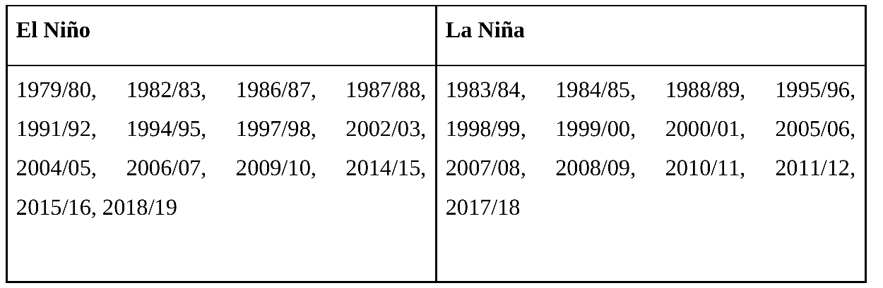 Cai, W., McPhaden, M.J., Grimm, A.M., Rodrigues, R.R., Taschetto, A.S., Garreaud, R.D., Dewitte, B., Poveda, G., Ham, Y.G., Santoso, A., et al, 2020: Climate impacts of the el ni˜no–southern oscillation on south america. Nature Reviews Earth & Environment 1(4):215–231, https://doi.org/10.1038/s43017-020-0040-3
